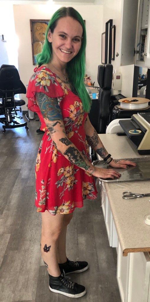 Hi! I’m Liz! I have been in love with tattooing and the art of tattooing for over 20 years. After one failed apprenticeship (I found myself pregnant with a beautiful daughter) and finally having a chance at a second one years later I am never not going to be tattooing or creating art. I began my apprenticeship in San Diego, CA with an amazingly talented artist named Chapi Walker in 2019. After working with him I went on to work in a private studio and learn from the amazing anime artist Jay Martinez in 2020. In December of 2021 I found myself in a pickle and had to make a decision, keep tattooing in San Diego or move to Anaconda, MT to be with my aging father. After lots of back and forth we decided to make the move to Montana. Since getting here my father and I worked hard to build out my own private studio in the front of our house. It’s so quant and, for me, the ideal setting to get tattooed. It has a picture window that outlooks our beautiful mountain range. I have a huge flock of birds that feed regularly from feeders year round. The trickle of my aquarium has even sent some clients to sleep! I hope you get the chance to experice it for yourself!